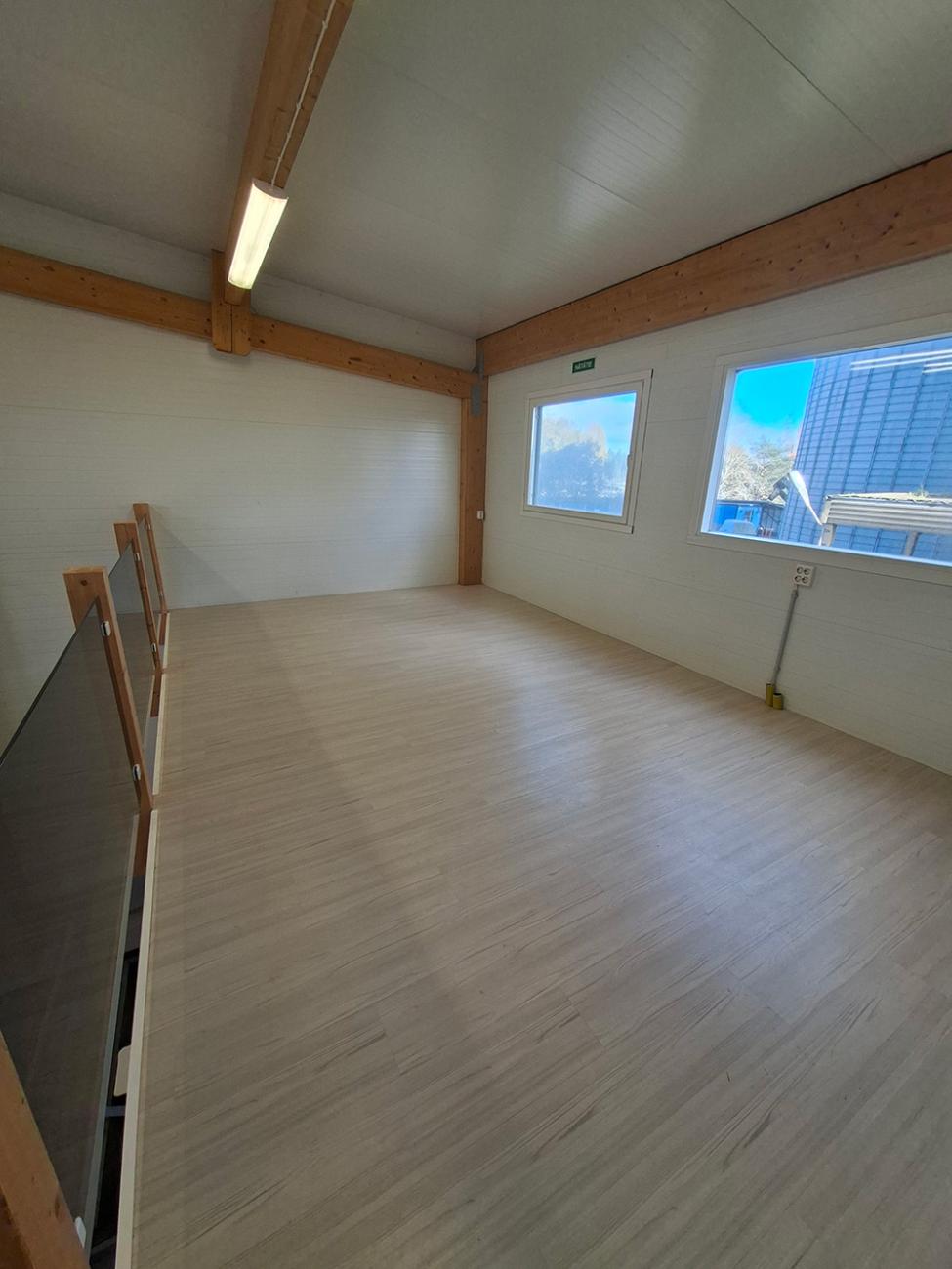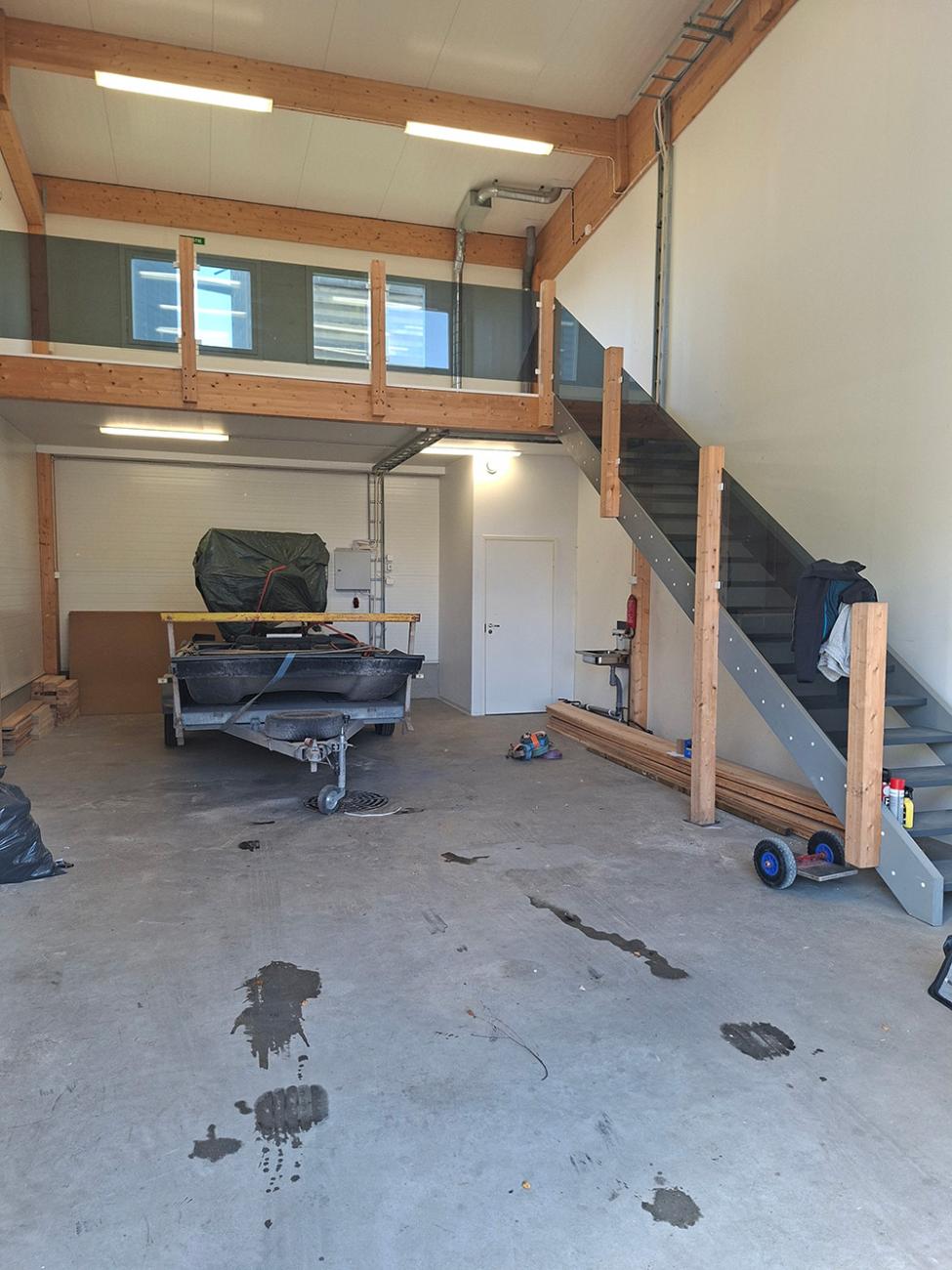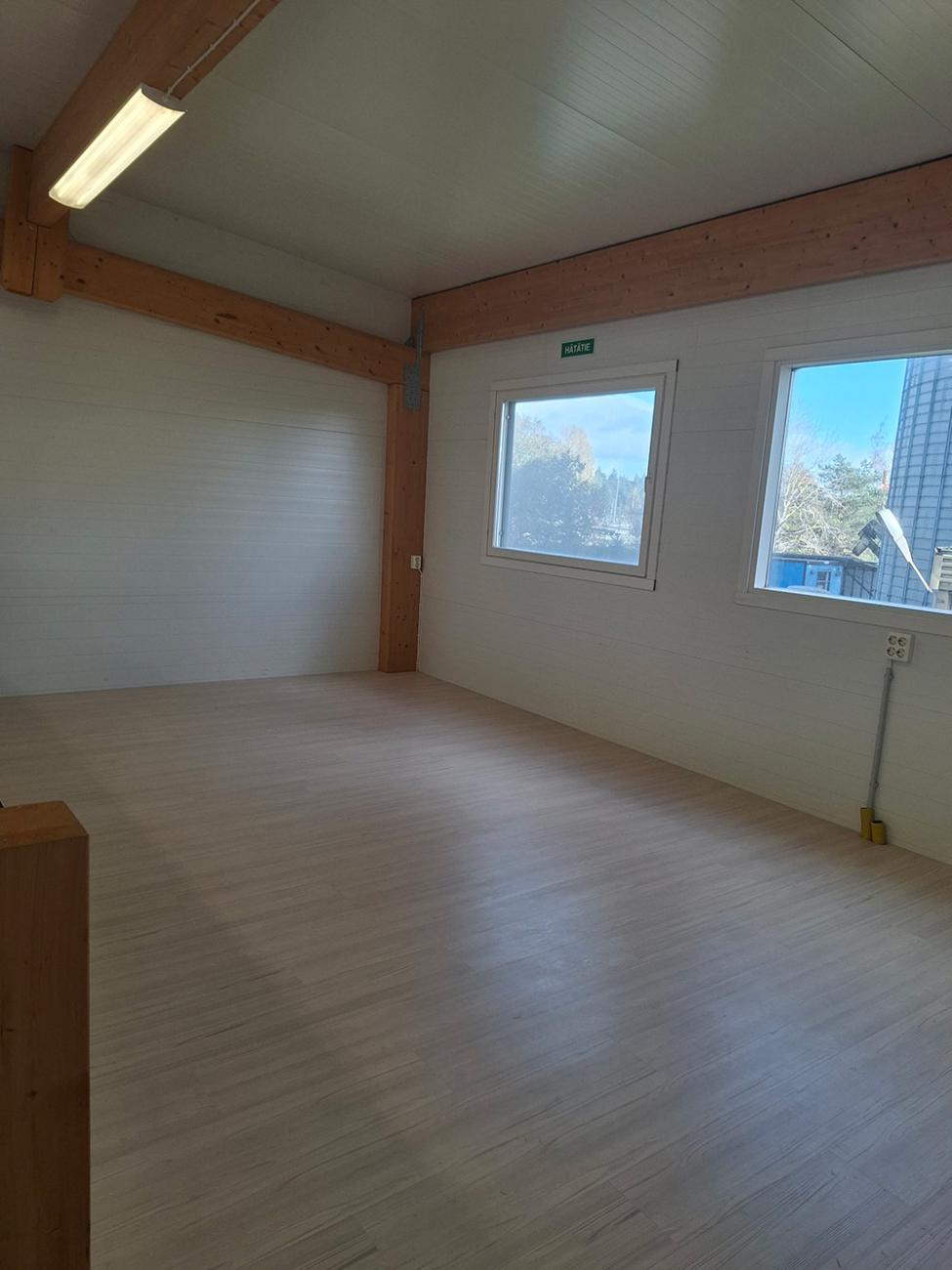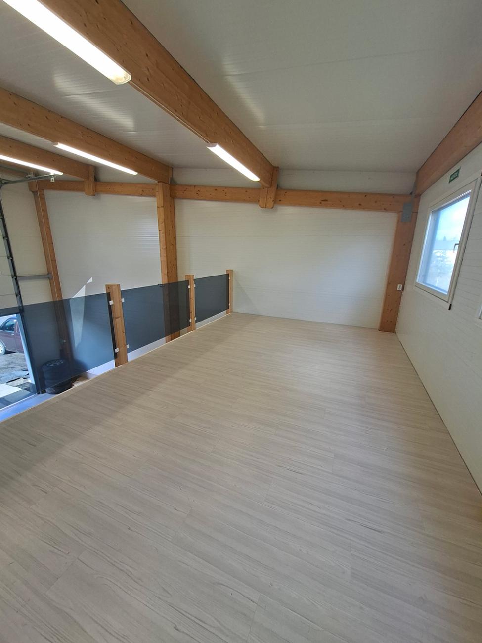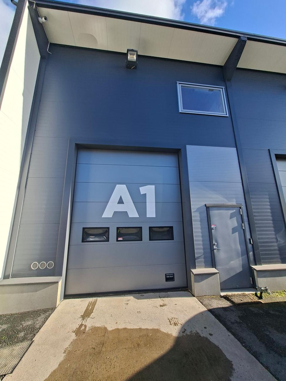 Hallitilaa 61m2 ja avoparvi 21 m2. Nosto-oven korkeus 3,8 m ja leveys 3 m. Tämän lisäksi erillinen käyntiovi.